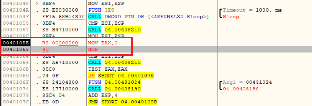 바꿔주는 이유는 당연히 EAX를 0으로 바꾸면 디버깅하고 있지 않다는 뜻이니까요!