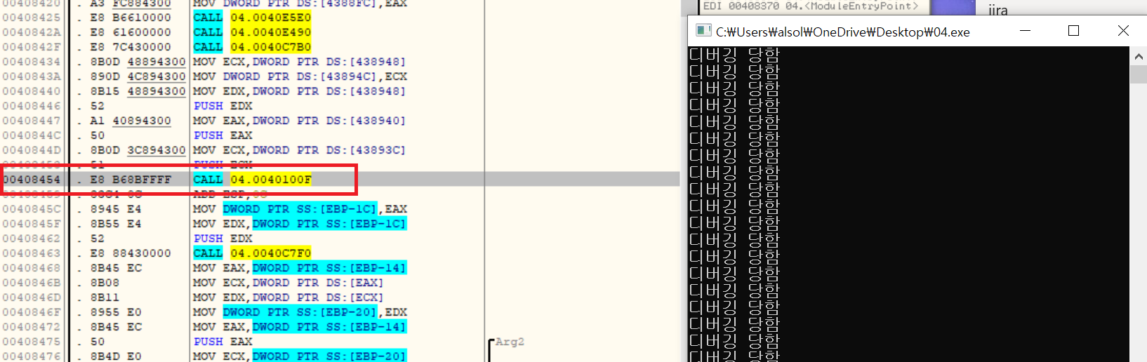 계속가다 401074 주소의 함수에서 "디버깅 당함"이라는 문자열이 출력됩니다.