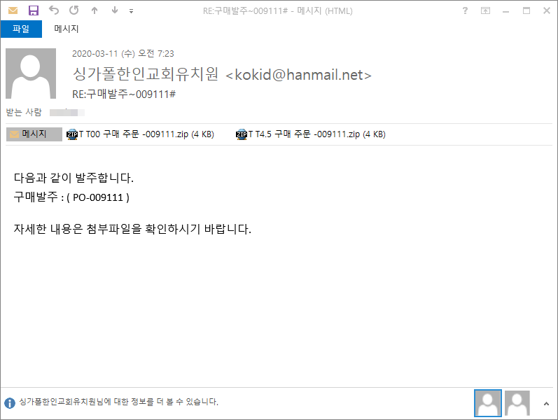 위의 사진과 같이 발주 메일로 가장하여 첨부파일을 보내는데