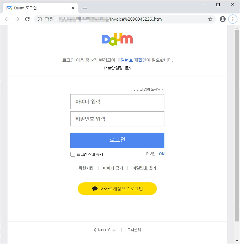 첨부 파일에는 공격자가 국내 포털사이트 다음의 가짜 로그인 화면으로 이동하는 파일이 들어있습니다.