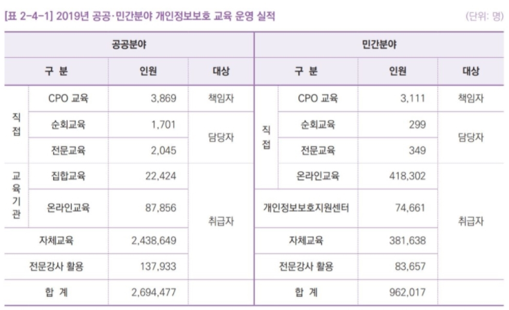 개인정보보호에 대한 인식 제고를 위해 전 직원 대상 반기별로 교육을 진행했으며, 용역사업자들에게도 교육 및 관리·감독을 주기적으로 실시하고 있습니다. 개인정보보호 업무담당자는 개인정보보호 콘퍼런스·전문교육·워크숍 등 참석하여 전문역량을 강화했으며, 내부 업무포털에 규정·수칙 등을 게시하고 있습니다.