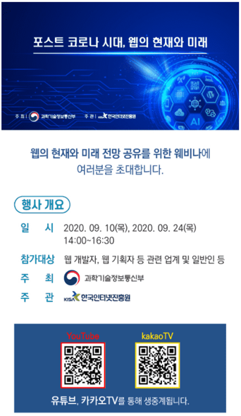 각 분야의 전문가들이 참여를 할 것이며 코로나19 이후 웹 산업의 변화, 비대면 시대에 전망 있는 웹 기술 및 서비스에 대한 패널 토론시간도 가진다고 합니다!